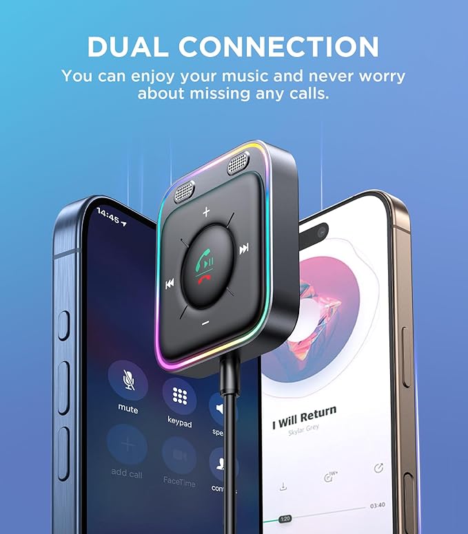 - Clearer Calls: The Bluetooth car adapter is equipped with dual microphones working in tandem to collect your voice from 360° for smoother calls. The upgraded CVC8.0 technology and built-in filter IC effectively filters out more road noise, current sound, and other distractions, resulting in clearer hands-free calls on both ends of the line