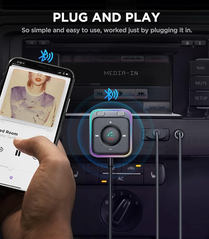 - Special Feature : AUX/TF/Bluetooth Multi-Mode connection, satisfying different needs, Dual-Mics ENC Noise Cancellation, accurately picks up human voice, clearer calling experience, Independent Control Buttons, easy to play/pause music or answer/reject calls, Latest Bluetooth 5.4 technology, low latency, stable connection within 30m, Plug and Play: Just plug it into the 3.5mm aux jack and power it through the USB port! Start the car, the Bluetooth adapter will automatically pair with your phone immediately. AUX/TF/Bluetooth Multi-Mode connection, satisfying different needs, Dual-Mics ENC Noise Cancellation, accurately picks up human voice, clearer calling experience, Independent Control… See more