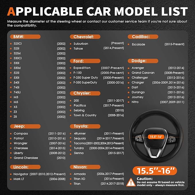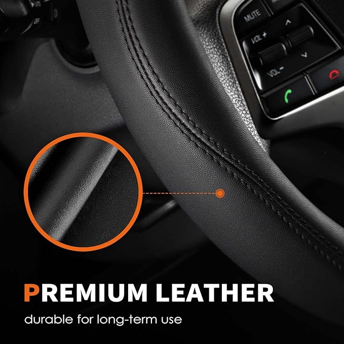 - FITS LARGE STEERING WHEELS–SIZE GUIDE INCLUDED: This HOTOR leather steering wheel cover is designed for large-size steering wheels (15.5–16.0 inches ). It fits full-size pickup trucks, large SUVs, and commercial vans, such as Ford F-150, RAM 1500, Chevrolet Tahoe, and Ford Transit.Before ordering, we strongly recommend measuring your steering wheel diameter to ensure the correct size selection