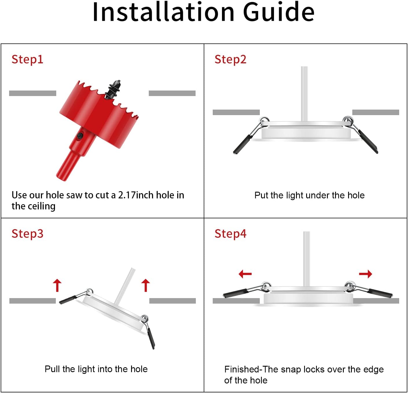 - [Easy Installation] - Easy to install. No screws needed, just put the 12v recessed led lights in the hole after connecting the power supply. Comes with a hole saw for easy installation
