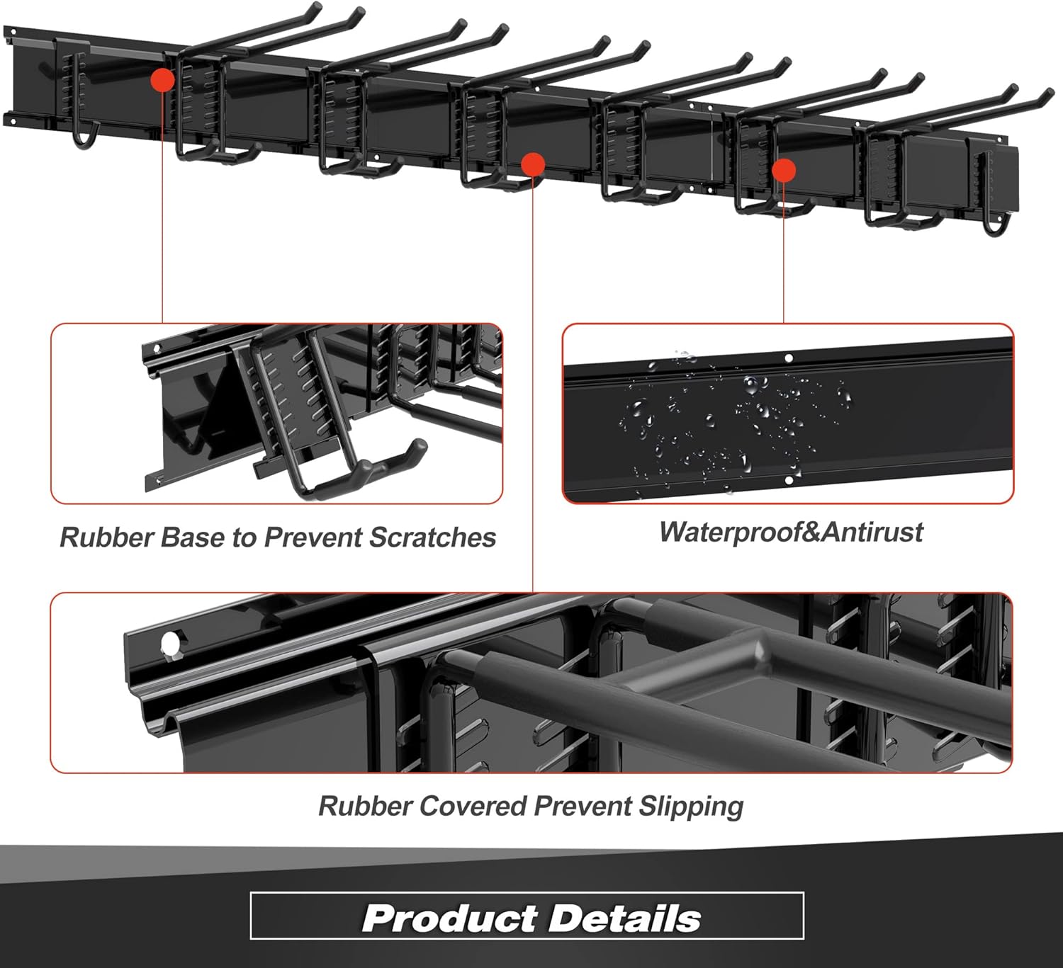 Storaboks Heavy Duty Garage Storage Rack System, Wall Mounted Tool Organizer with 8 Double Hooks, 3 Rails, Garden Yard Tools Hanger for Ski Gears, Broom, Rake, Shovel