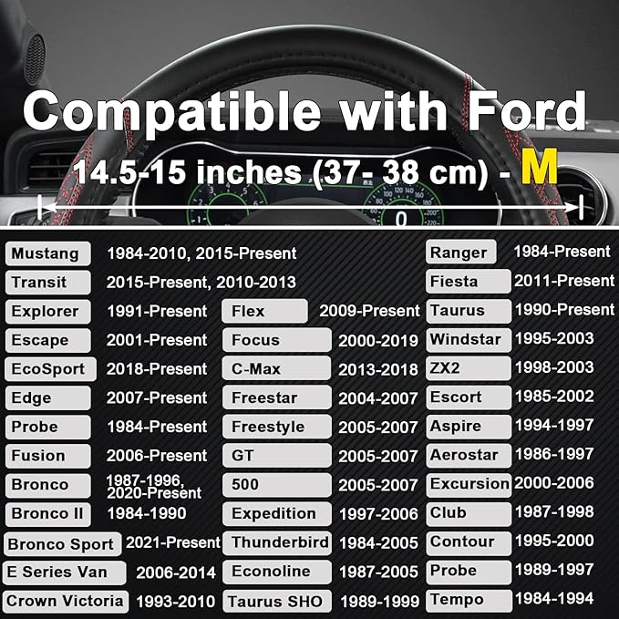 - 【HIGH QUALITY MATERIAL】This Ford steering wheel cover is made of high quality leather, which is soft texture, comfortable, eco-friendly, wear-resistant and durable.