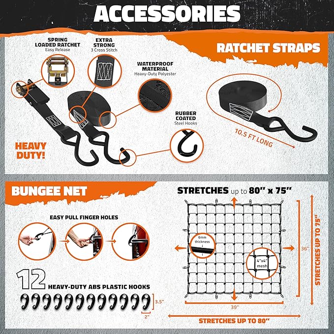 - Includes Roof Cargo Basket Accessories: This car & SUV roof rack cargo carrier comes with a 6mm-thick bungee net to stabilize cargo on rooftop basket . Measuring 39"x35" & expandable up to 80"x75", the car roof basket cargo net features 4"x4" mesh openings & 12 sturdy ABS hooks with easy-grip finger holds, so you can quickly & easily secure various sized payloads. Paired with two 10-foot ratchet straps, the Mockins Cargo Carrier Rooftop Rack Set keeps your gear safely in place for every trip.