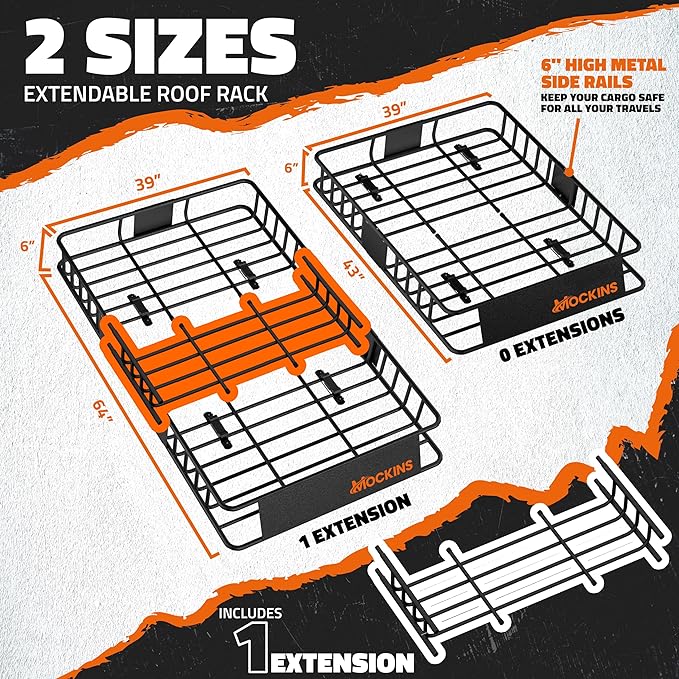 - Extendable Roof Racks For SUV & Car: Heading out for your next adventure? Maximize your roof cargo rack storage while keeping your cabin spacious & passengers comfortable with this heavy duty roof rack cargo basket . The roof basket cargo carrier measures 64"x39"x6", offering generous room for luggage, sporting equipment, tools, or camping supplies. The innovative roof carrier set features a rooftop cargo rack that extends from 43" to 64", providing versatility & durability for any load amount.