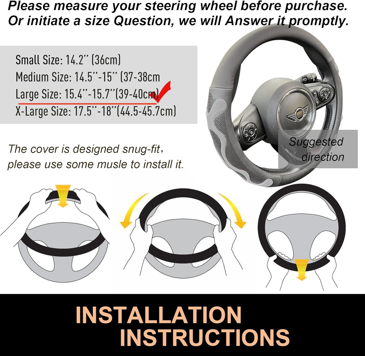 - Installation Instructions: The PINCTROT steering wheel cover is designed to be flexible and snug-fitting. During installation, please exert some force to ensure a secure fit. In the case of some steering wheels with a larger grip circumference, we recommend choosing a size up for optimal installation.