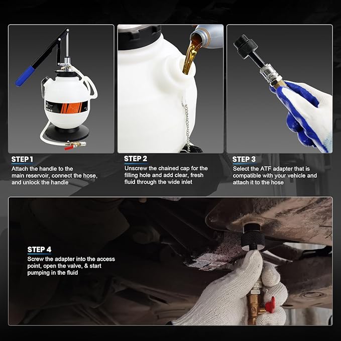 - Simple Operation: Detachable hand crank featuring hydraulic pressure design and high pressure resistance, easily press and quickly pump clean oil into the gearbox. 7.5L big capacity well constructed container, is marked with accurate scale to help observe the amount of liquid. 1.2M transparent hose has a quick coupler to connect ATF adapter easily, with a ball valve to control the fluid flow, very convenient. Blow-molded storage case providing convenient storage and transport.