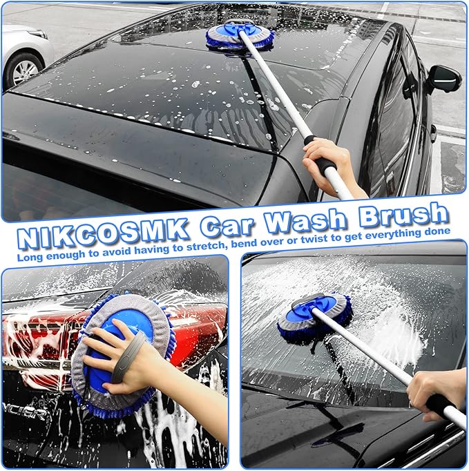 - 【62" EXTRA LONG CAR WASH BRUSH MOP】The NIKCOSMK car wash mop consists of 4 sturdy aluminum alloy rods and chenille microfiber brush heads, which are designed with a snap buckle, which is detachable and easy to assemble. You can easily wash the roofs of cars, rv, SUVs and trucks, as well as hard-to-reach surfaces dirt and grit. Our car wash mop has a non-slip handle that provides a 180-degree cleaning angle and won't stretch or retract at will to scratch your car.