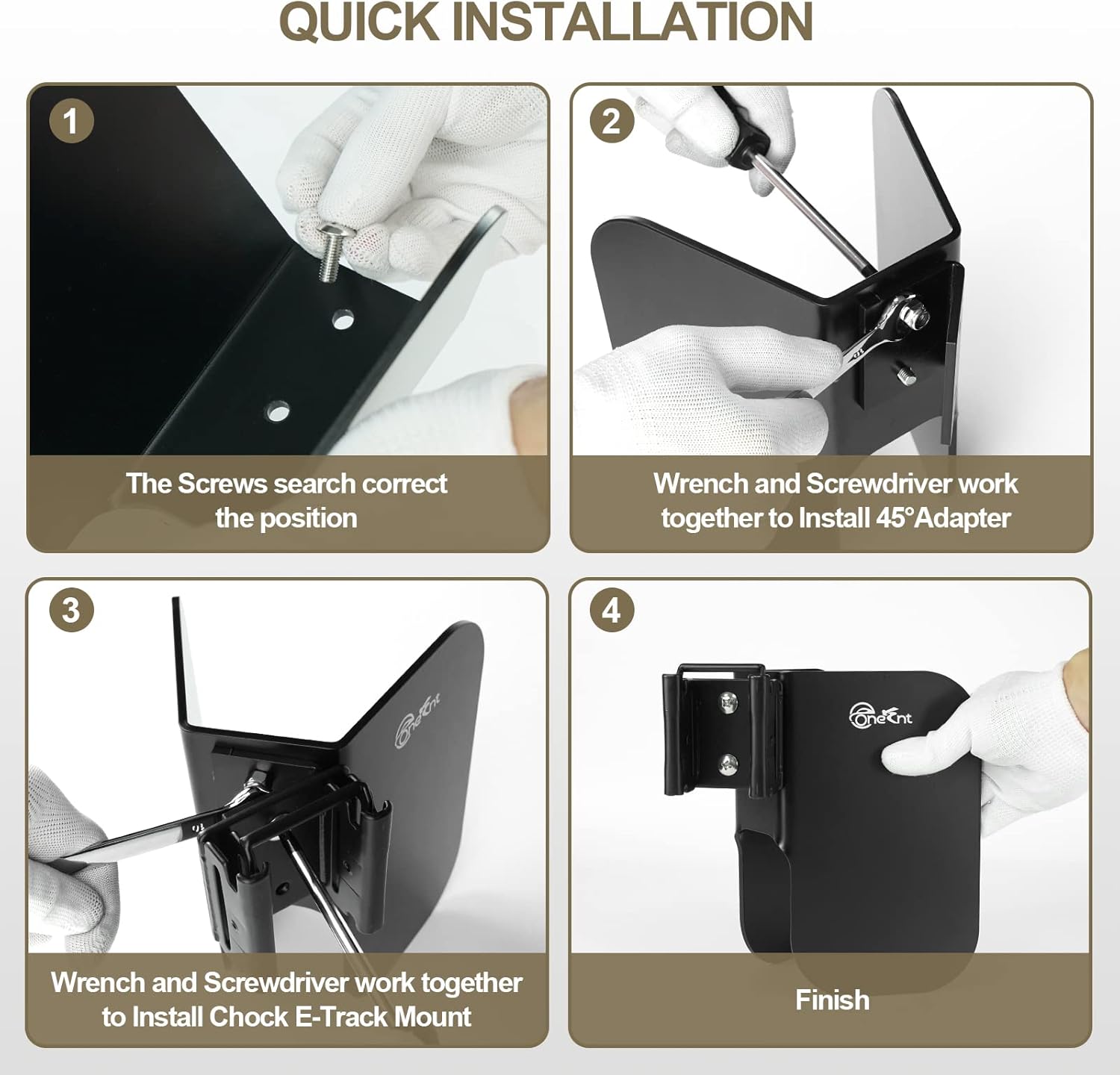 - Package Inclued:4 Pcs E-Track Wheel Chock, 4 Pcs Chock E-track mounts, 4 Pcs 45 Angle Adapte, 20 Pcs Screws and Nuts, 1 Pcs Wrench and 1 Pcs Screwdriver