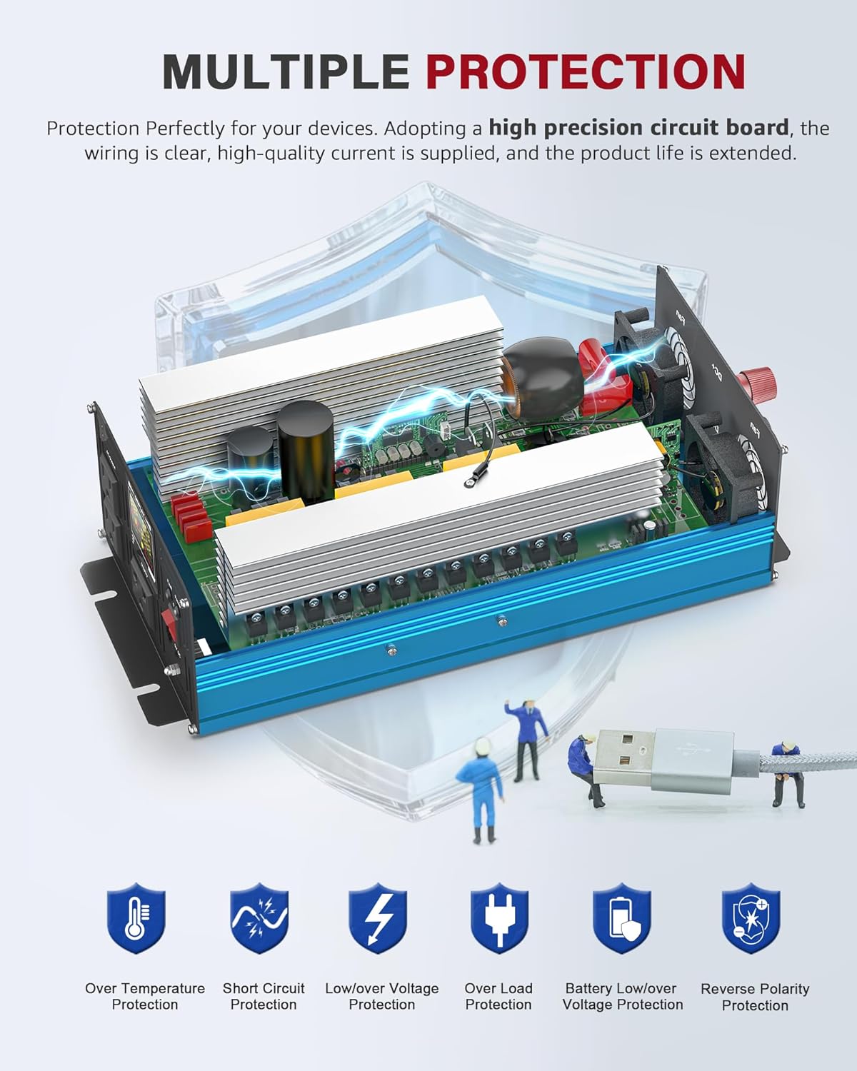 - 【LCD DISPLAY & REMOTE CONTROL】 The constantly updated 12V power inverter LCD screen displays the input and output voltage, battery capacity, protection indication in real time, and the inverter's use status is clearer. With the remote control, it is more convenient to switch on and off.