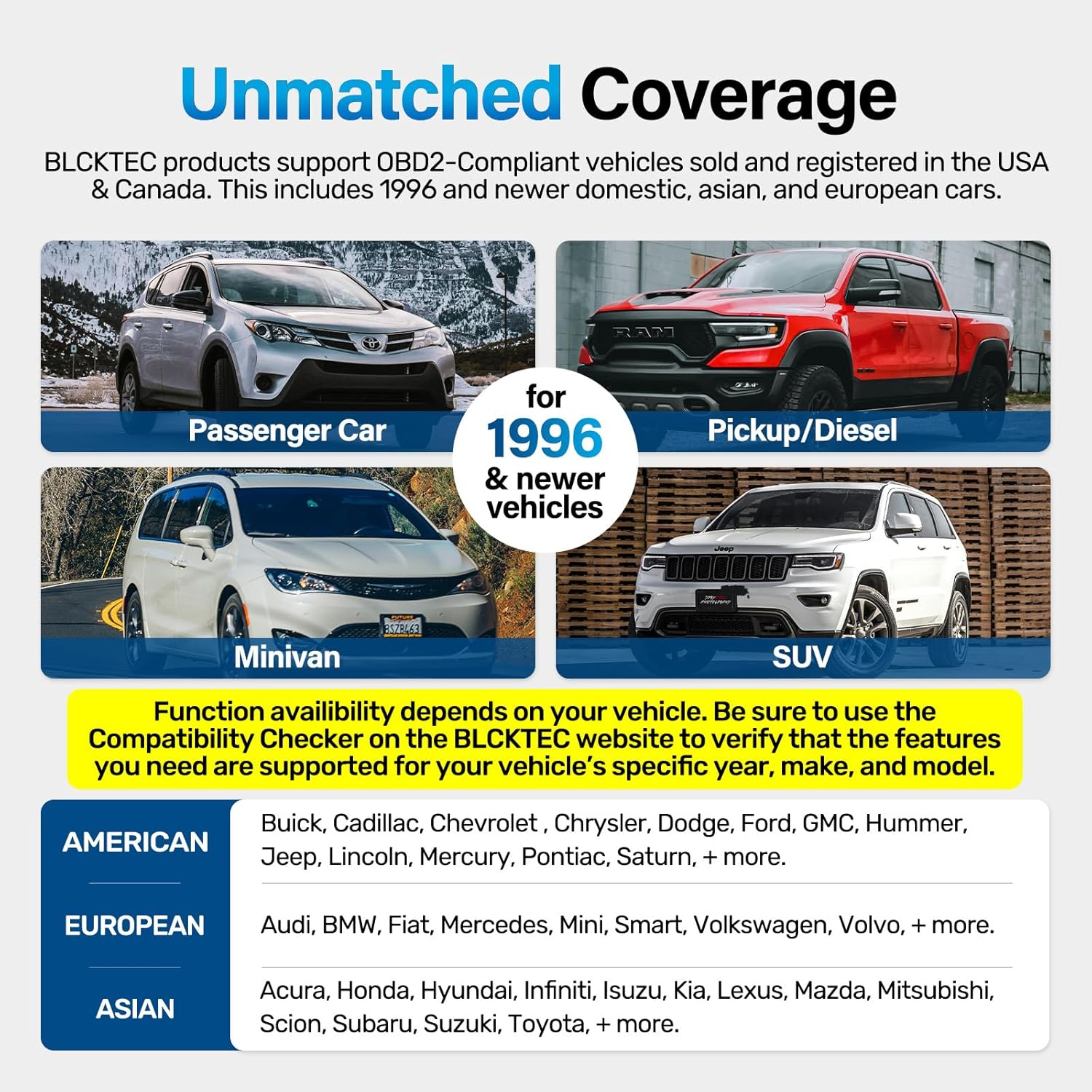 - [Check Before You Buy] - BLCKTEC 430 and the App RepairSolutions2 can only be used in the USA and Canada, other countries and regions will not be supported. While the product works on most OBD2-compliant vehicles 1996-2023 models, available functions may vary by make and model. Before purchasing, be sure to use the Compatibility Checker on BLCKTEC website or contact our customer support to ensure the features you need are supported.