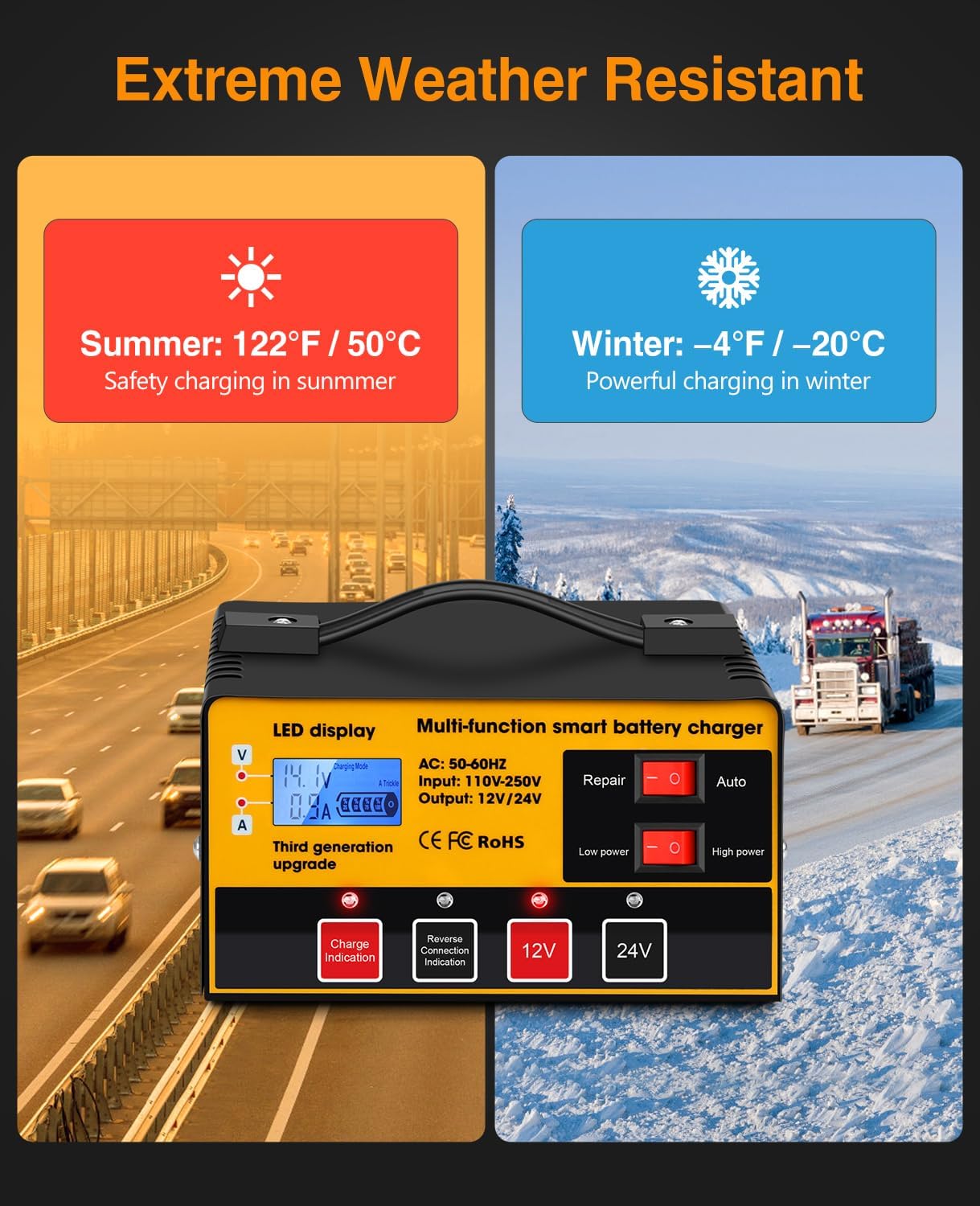 Outerman Car Battery Charger,12V-12A/24V-8.5AMH Smart Automatic Battery Charger,High/Low Power Trickle Charger Battery Maintainer and Desulfator,for Motorcycle Lawn Mower Marine Lead Acid Batteries