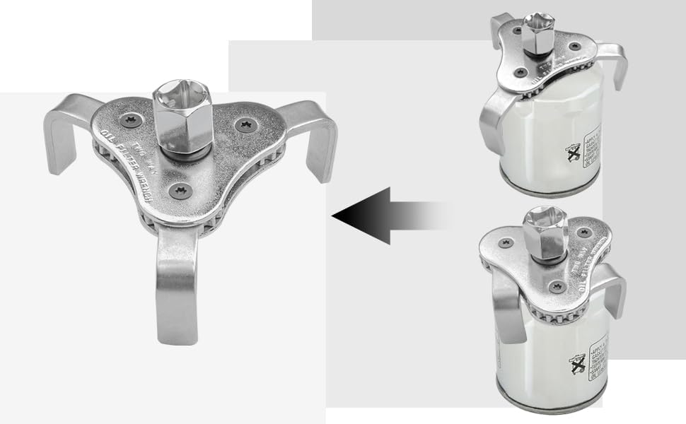 - UNIQUE DESIGN WRENCH:Two major designs are added to this adjustable oil filter wrench, The first highlight is the 3-jaw design, compared to the traditional two-point oil filter wrench, the three-jaw design is stronger and easier to make your oil filter off. The second is the two-way design, no matter where you pick up your universal wrench, you can immediately install your oil filter and remove it without worrying about the direction.