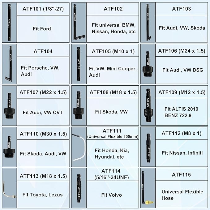 - ATF Adapters: There are 15 specific ATF adapters included in this ATF fluid pump kit, work as connectors for car oil pan ATF filling tool and perform transmission fluid refill service for the ATF filler system. Multiple adapters constructed from hardened steel for maximum strength and longevity. Black electrophoretic finish for rust and corrosion resistance. Kit is suitable for Ford, BMW, Nissan, VW, Audi, Toyota, Volvo, Porsche, Benz, Hyundai, Infiniti, Lexus and etc