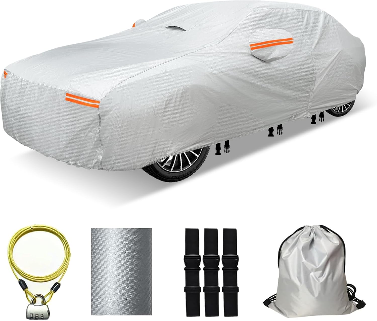 30 Layers Car Cover for Automobiles All Weather Waterproof, Outdoor Snowproof UV Protection Windproof, Door Zipper, Soft Cotton, Heavy Duty Universal Car Covers, (Silver, Fit Sedans 201"-210")