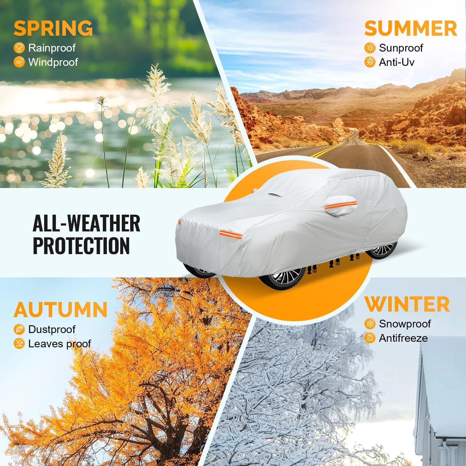 - The car cover is equipped with 3 windproof straps strategically placed around the cover for enhanced stability during strong winds.