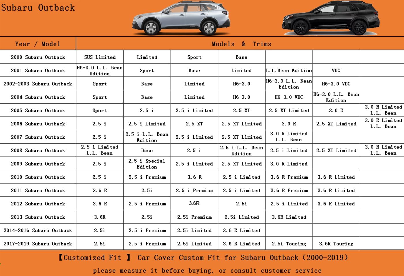 - ăSuitable forăâ Custom fit for Subaru Outback (1994-2025). Come with a large enough portable bag to store your cover when you do not use