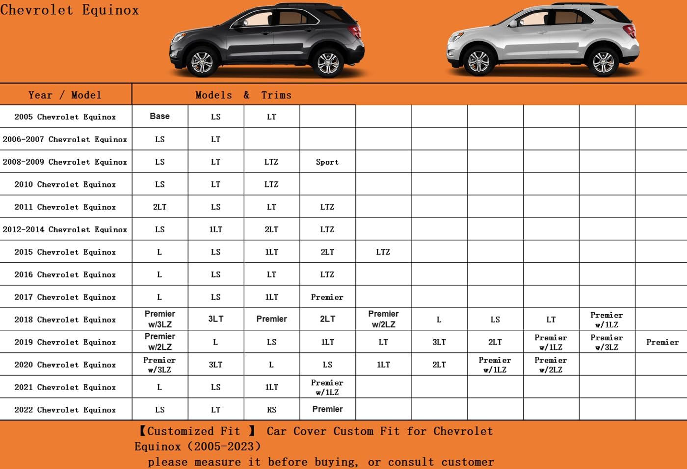 - ăSuitable forăâ Custom fit for Chevrolet Chevy Equinox (2005-2025). Come with a large enough portable bag to store your cover when you do not use