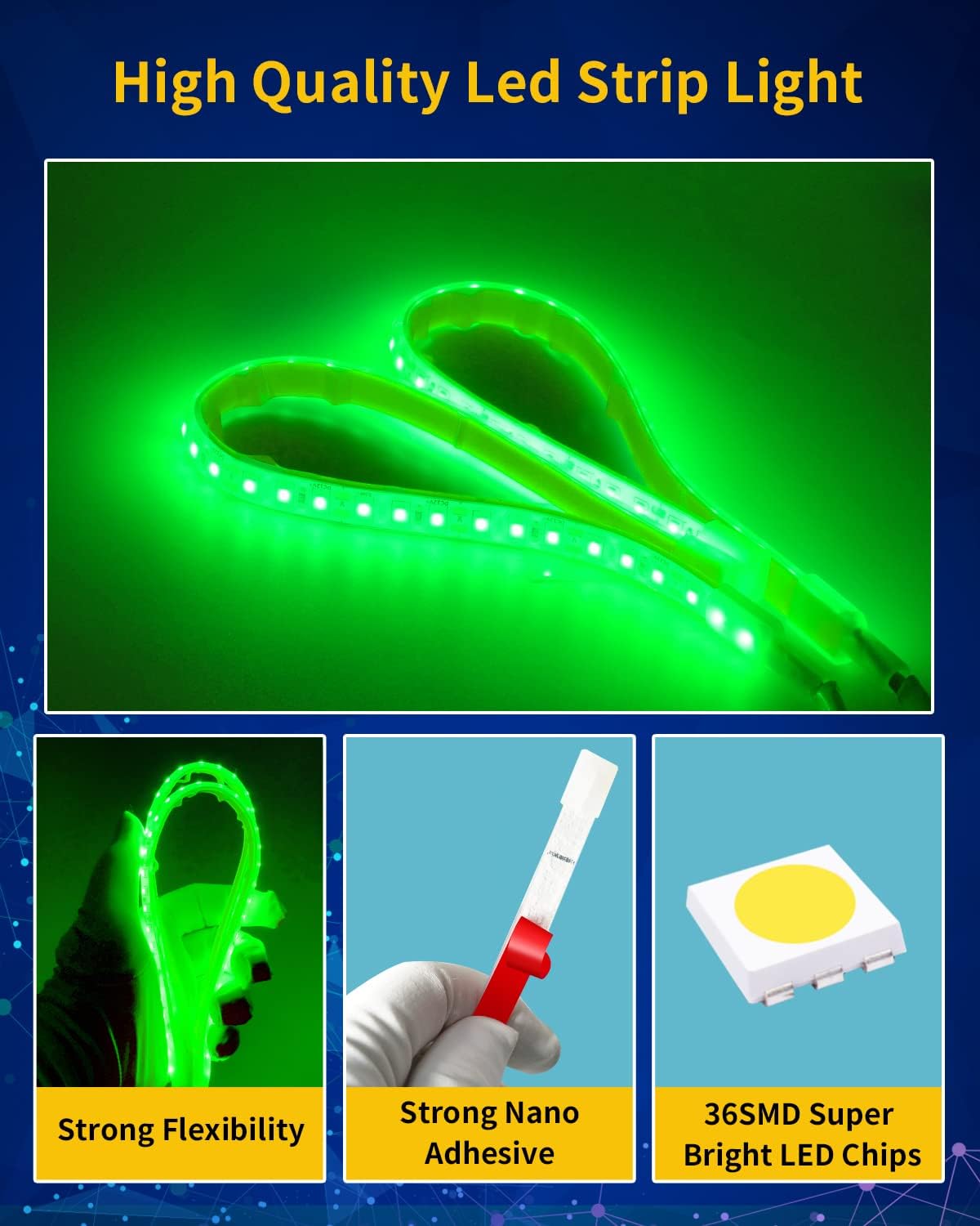 - 【WIDE APPLICATION】Our green led strip lights perfect to use for RV,car,boats,truck,suv,golf cart underglow motorcycle automotive,cargo trailer, under dash lighting interior & exterior front grille,boat deck light Courtesy Interior Lights Fishing Night atmosphere light and also for Home, Kitchen, Room, Bedroom,cabinet,bar,party decor accent lights.Simple design for you to decorate your automotive or home a beautiful, safety and romantic interior.
