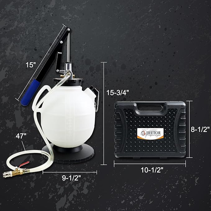 - Packing List: JIFETOR transmission filling pump tool kit contains one 7.5L oil can with manual pump assembly and 1.2M transparent hose, one 15" detachable metal hand crank, 15 PCS transmission fluid adapters well packed in a customized blow molding case, 1 dual head screw driver, 1 wrench (8MM and 10MM). JIFETOR transmission fluid dispense tool kit will be a good helper for you to replace the transmission oil