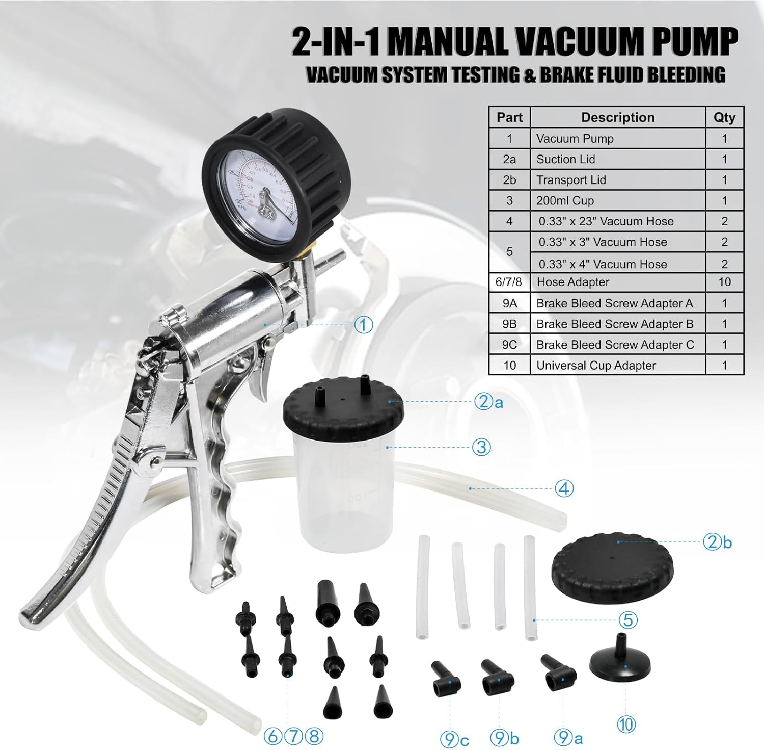 - Complete Accessories: Include vacuum pump with gauge, 7oz reservoir jar and 2 lid, 6 connection tubes(24"*2,3"*2,4"*2), 8 tapered adapters, 2 tapered manifold plugs,3 bleed screw adapters and cupped adapters. Additionally, it comes with a convenient carry case for easy transportation and storage