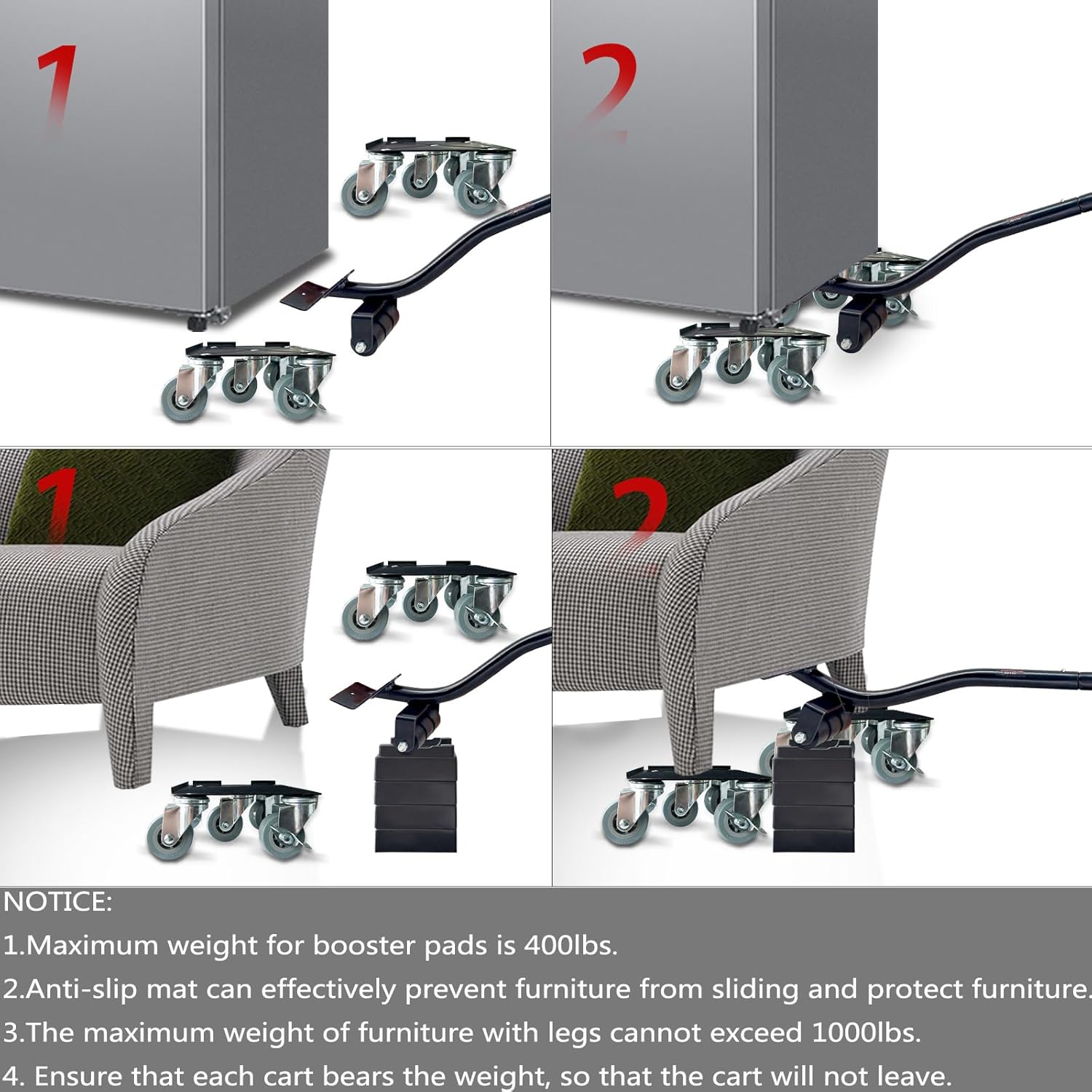 - Easy To Operate:Use the principle of leverage. You can easily lift one side of the furniture; then put the pulley under the foot of the furniture, if you need to raise the height can be put to raise the cushion,then put in the moving dolly on the bottom of the furniture,and lock the universal wheel,the four furniture moving wheels into the bottom of the furniture,and then open the universal wheel brake,without the help of others,you can easily move furniture and other heavy objects.