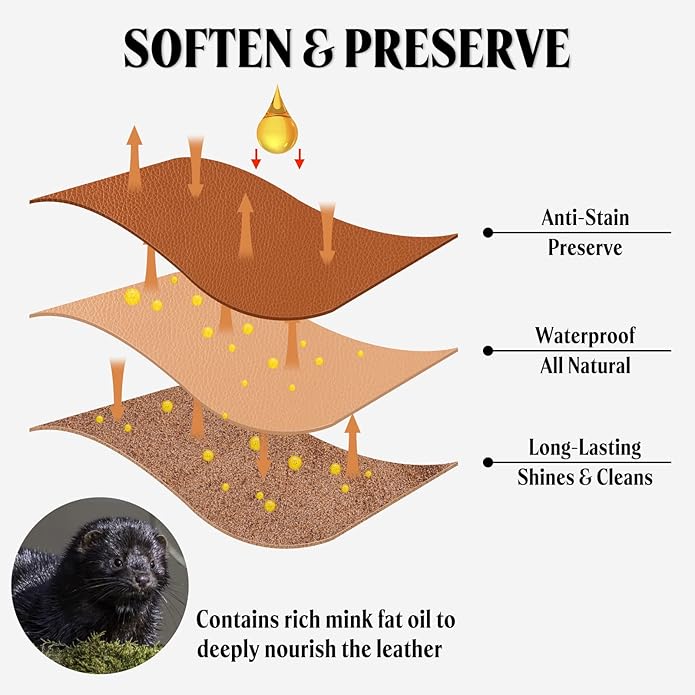 - SUITABLE FOR OILED & NATURAL LEATHER: Mink oil for leather helps to sustain the oiled and natural leather by providing a coat of oil that perseveres your leather and helps it keep in optimal condition for any terrain outside. Spot test before use-Not for use on napped leathers, suede leather, frosted leather, soaked leather, patent leather