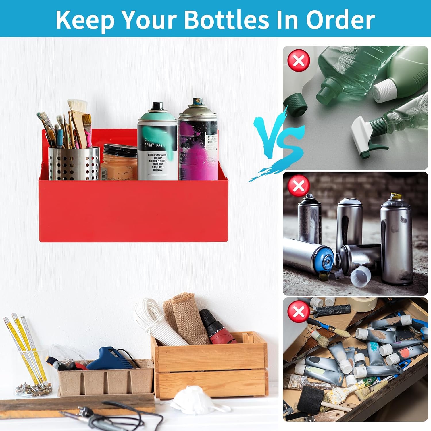 - Easy-to-Use and Clean: The spray can holder can hold at least 3 aerosol bottles within 3" diameter. The size is 8.3" x 2.8" x 3". Featuring an open design, this tool box allows for effortless tool retrieval and easy cleaning. Simply get what you need and go to work. Maintain a neat and organized workspace with ease.