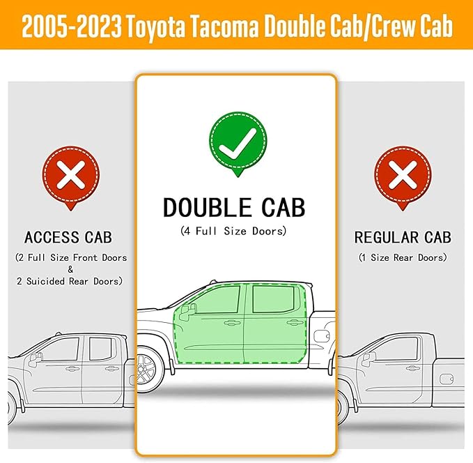 - Vehicle Service Type : 2005-2023 Tacoma Double Cab with 4 Full-size Doors