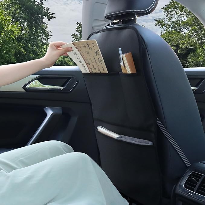 - HIGH QUALITY AND DURABLE - The front of the car seat back organizers is made of high-quality upholstery leather, which is elegant and high-grade, and the soft felt on back protects seatback, the rounded corners are not easy to collapse or curl, and the thickened and enlarged kick mates last longer
