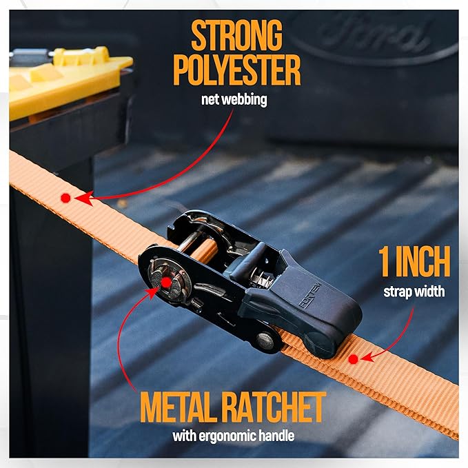 - Multifunctional – Tie down straps ratchet mechanism offers durability and security to transport a variety of objects. Securely tie down your motorcycle, bike, kayak, UTV, boat, ATV, boxes, boat, cooler, & other cargo via trailers, or car roof rack.