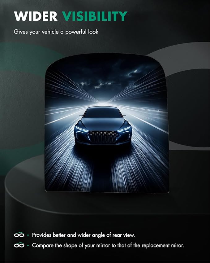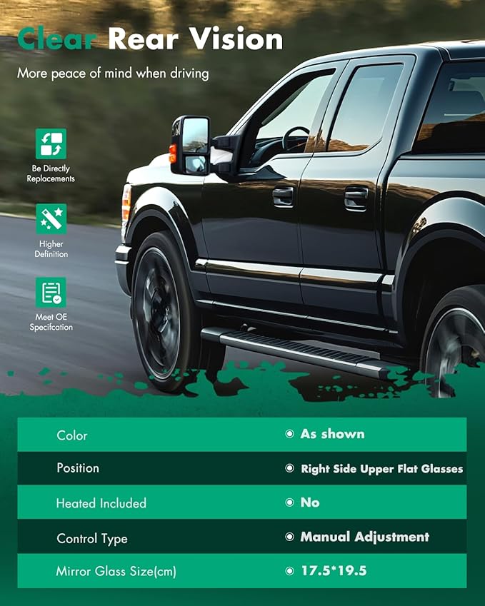 - 🚗More Functions And Style Options - This lens has the following characteristics: Manual Adjustmet,Right Side Upper Flat Glass,Non-heated,No Arrow Lights,No Plastic Backing Plate,With Adhesive Pads,1 Piece.