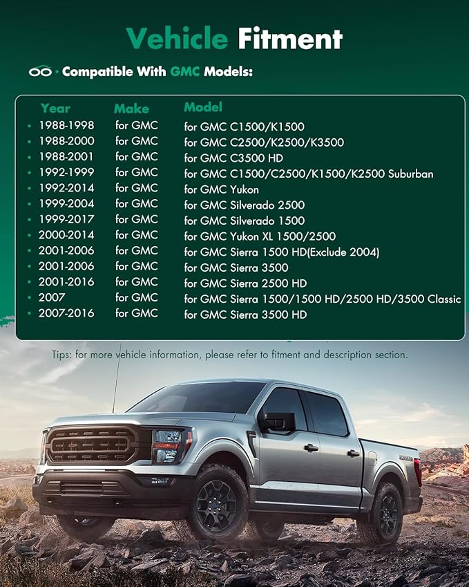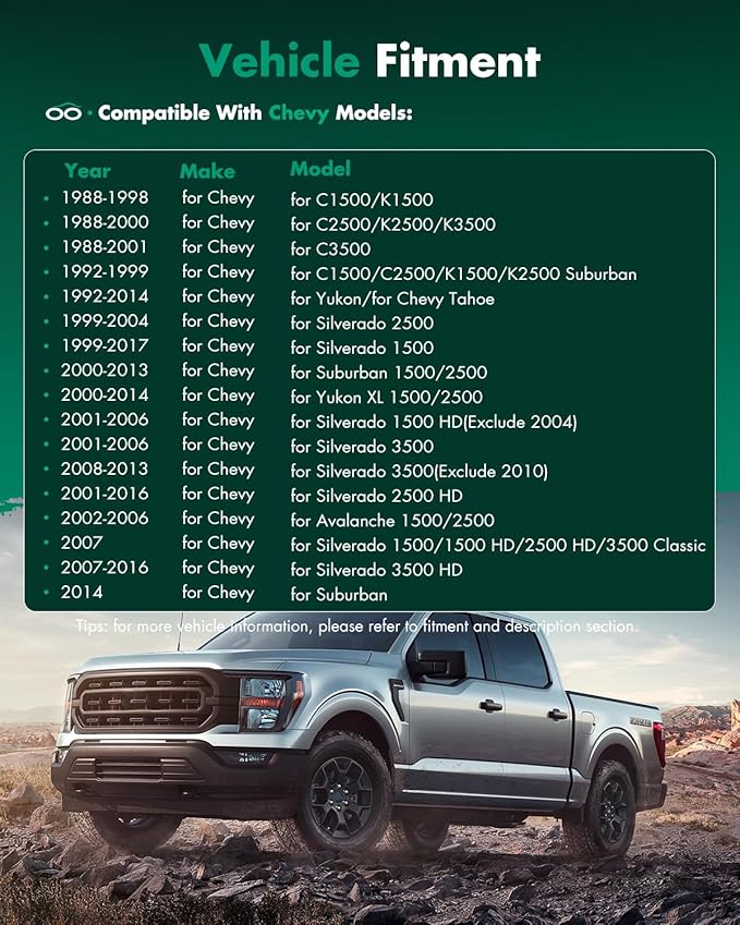 - 🚗Replaced Directly On These Vehicles Model - As a new mirror glass replacement, only works on select models, for 1992-1999 For Chevy/For GMC C1500/C2500/K1500/K2500 Suburban,1992-2014 For GMC Yukon/For Chevy Tahoe,1999-2004 For Chevy/For GMC Silverado 2500,1999-2017 For Chevy/For GMC Silverado 1500,2000-2013 For Chevy Suburban 1500/2500,2000-2014 For GMC Yukon XL 1500/2500,2001-2003 For Chevy Silverado/For GMC Sierra 1500 HD,2005-2006 For Chevy Silverado/For GMC Sierra 1500 HD.