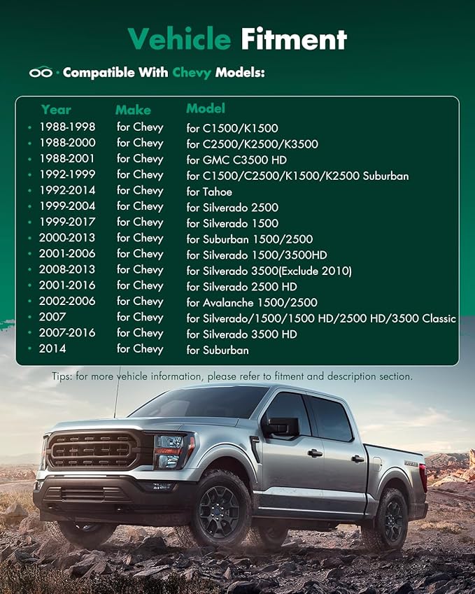 - 🚗Replaced Directly On These Vehicles Model - As a new mirror glass replacement, only works on select models, for 1992-1999 For Chevy/For GMC C1500/C2500/K1500/K2500 Suburban,1992-2014 For GMC Yukon/For Chevy Tahoe,1999-2004 For Chevy/For GMC Silverado 2500,1999-2017 For Chevy/For GMC Silverado 1500,2000-2013 For Chevy Suburban 1500/2500,2000-2014 For GMC Yukon XL 1500/2500,2001-2003 For Chevy Silverado/For GMC Sierra 1500 HD,2005-2006 For Chevy Silverado/For GMC Sierra 1500 HD.