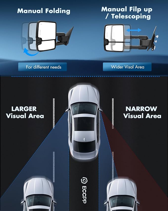 - Multifunction Of Tow Mirrors - Choose from towing mirrors equipped with many different Functions: Power Adjusted,Heated Function,LED Turn Signal Light,Running Light,Back Up Light,Manual Telescoping and Folding,with Black Housing