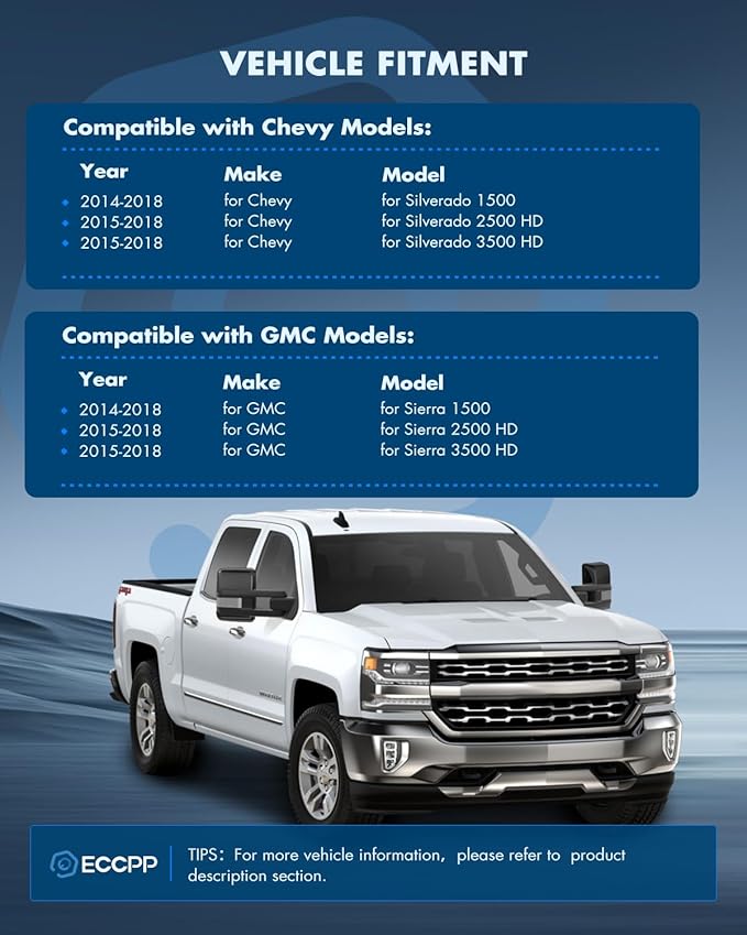 - Vehicle Fitment - The towing mirrors fit for 2014 2015 2016 2017 2018 For Chevy Silverado 1500 2015 2016 2017 2018 For Chevy Silverado 2500 HD 3500 HD 2014 2015 2016 2017 2018 For GMC Sierra 1500 2015 2016 2017 2018 For GMC Sierra 2500 HD 3500 HD [2-Door Regular Cab | 4-Door Extended Cab | 4-DoorCrew Cab] pickup truck