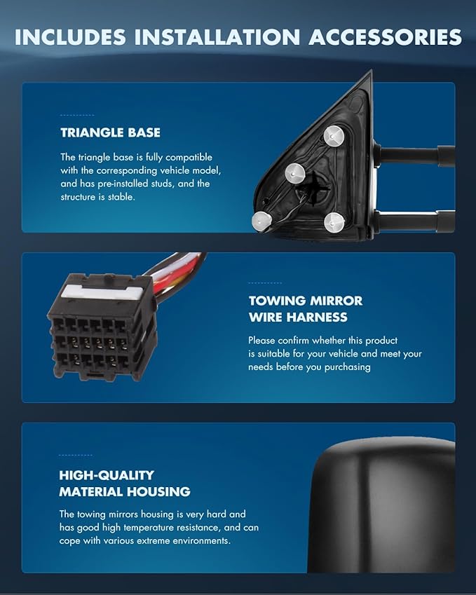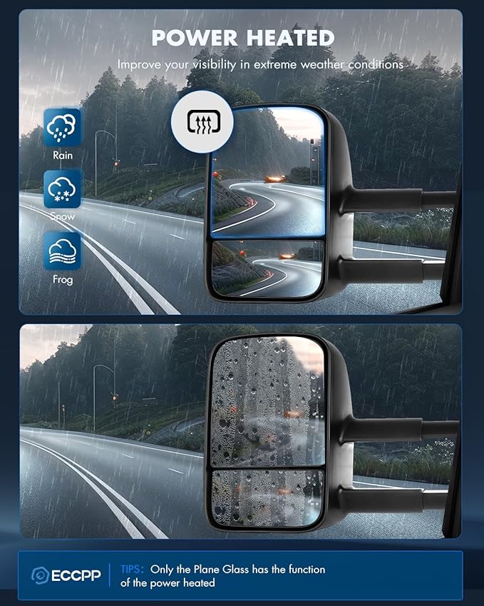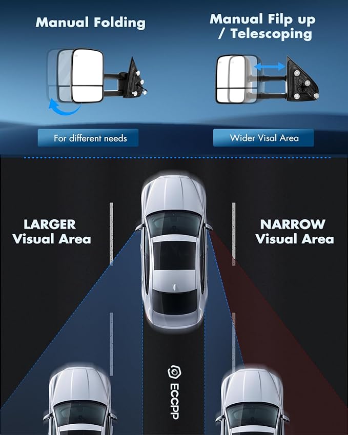 - Multifunction Of Tow Mirrors - Choose from towing mirrors equipped with many different Functions: Power Adjusted,Heated Function,Manual Telescoping and Folding,with Black Housing