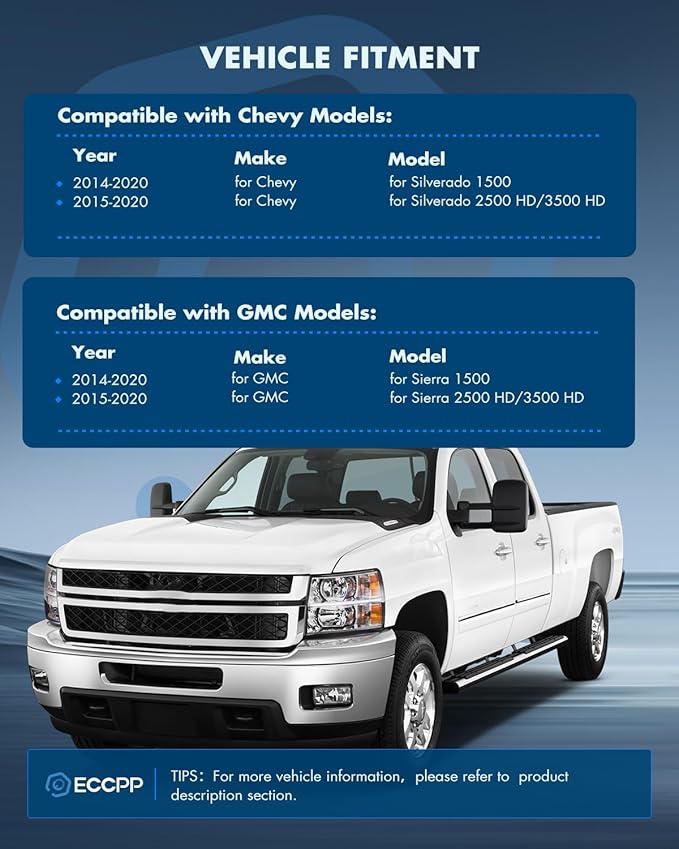 - Vehicle Fitment - The towing mirrors fit for 2014 2015 2016 2017 2018 2019 2020 For Chevy Silverado For GMC Sierra 1500 2015 2016 2017 2018 2019 2020 For Chevy Silverado 2500 HD 3500 HD 2015 2016 2017 2018 2019 2020 For GMC Sierra 2500 HD 3500 HD pickup truck