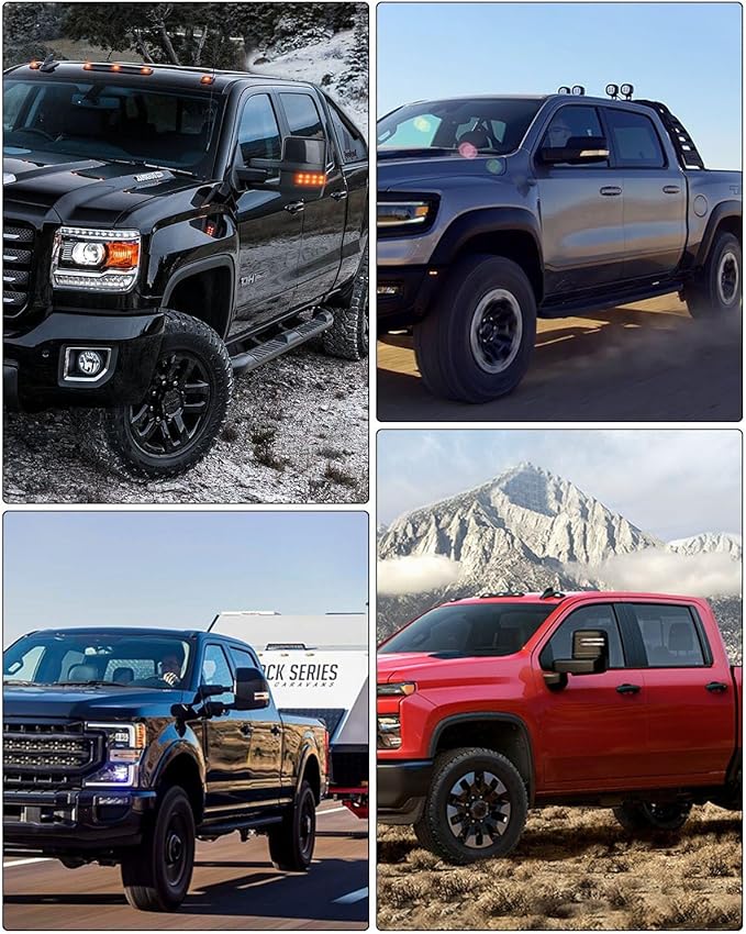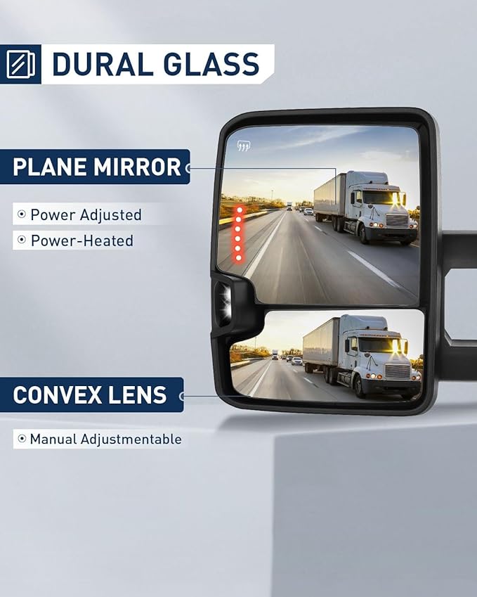 - Multifunction Of Tow Mirrors - Choose from towing mirrors equipped with many different Functions: Power Adjusted, Heated, Turn Signal Light, Lens with LED, Width Light, with Black Cap Housing, Manual Folding and Telescoping, Resemble Carbon Fiber Material Shell, Left and Right Side
