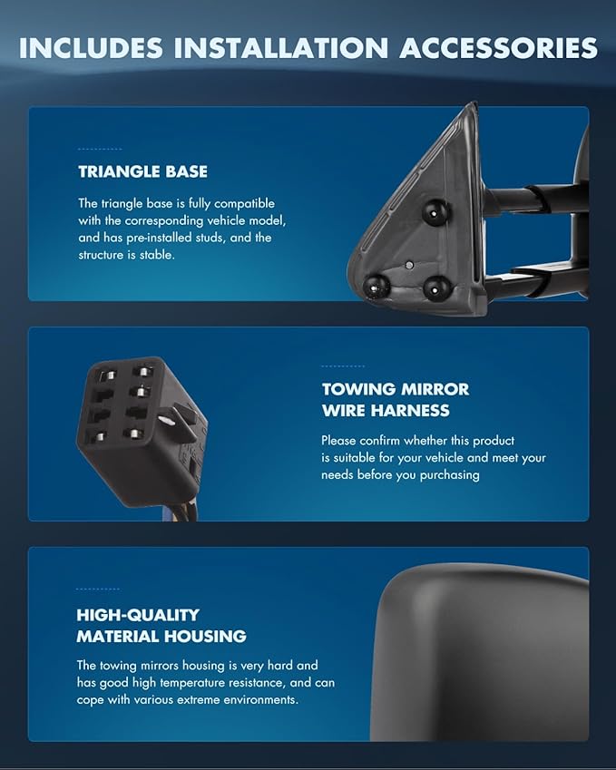 - Multifunction Of Tow Mirrors - Choose from towing mirrors equipped with many different Functions: Power Adjusted,Heated Function,Manual Telescoping and Folding,with Black Housing