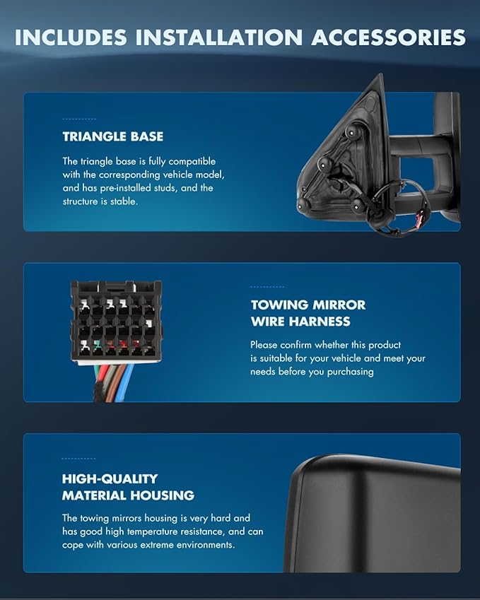 - Multifunction Of Tow Mirrors - Choose from towing mirrors equipped with many different Functions: Power Adjusted,Heated Function,LED Turn Signal Light,Width Light,Manual Telescoping and Folding,with Black Housing