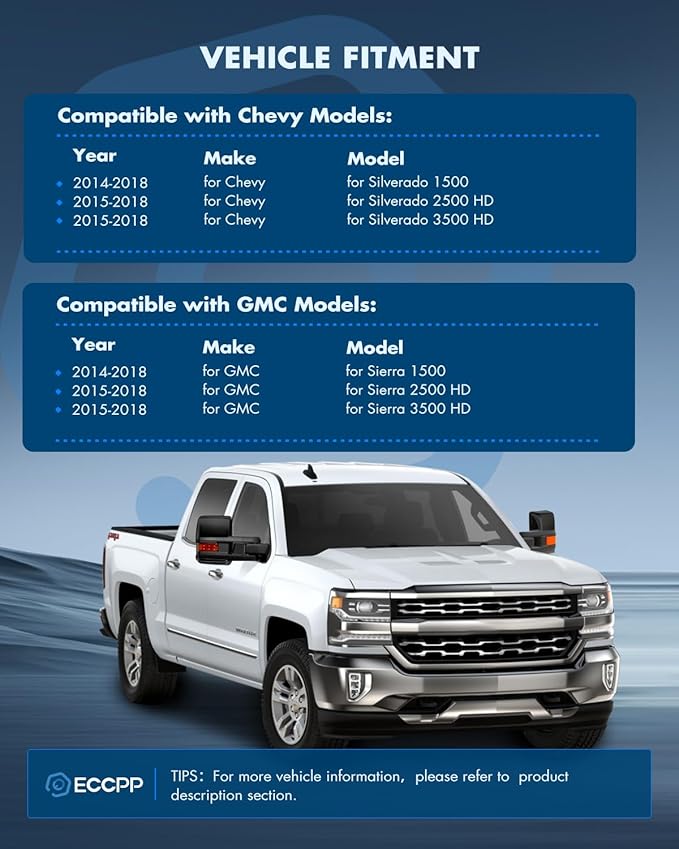 - Vehicle Fitment - The towing mirrors fit for 2014 2015 2016 2017 2018 For Chevy Silverado 1500,2015 2016 2017 2018 For Chevy Silverado 2500 HD,2015 2016 2017 2018 For Chevy Silverado 3500 HD,2014 2015 2016 2017 2018 For GMC Sierra 1500,2015 2016 2017 2018 For GMC Sierra 2500 HD,2015 2016 2017 2018 For GMC Sierra 3500 HD pickup truck