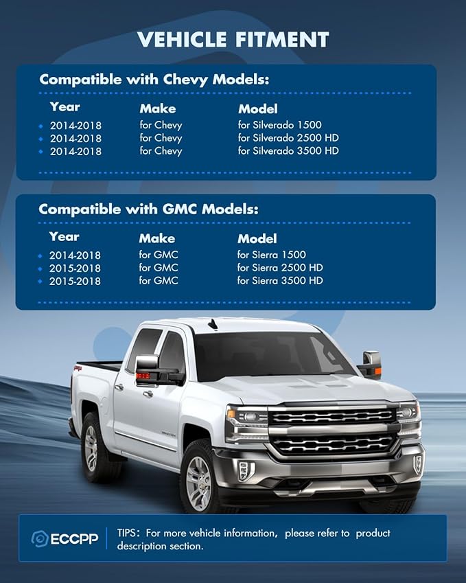- Vehicle Fitment - The towing mirrors fit for 2014 2015 2016 2017 2018 For Chevy Silverado For GMC Sierra 1500 For Chevy Silverado 2500 HD 3500 HD 2015 2016 2017 2018 For GMC Sierra 2500 HD 3500 HD pickup truck