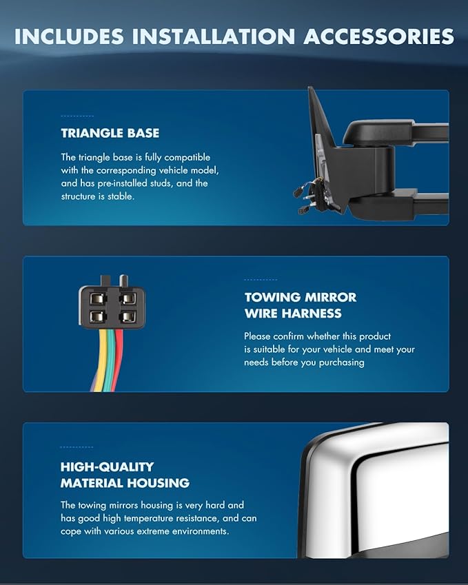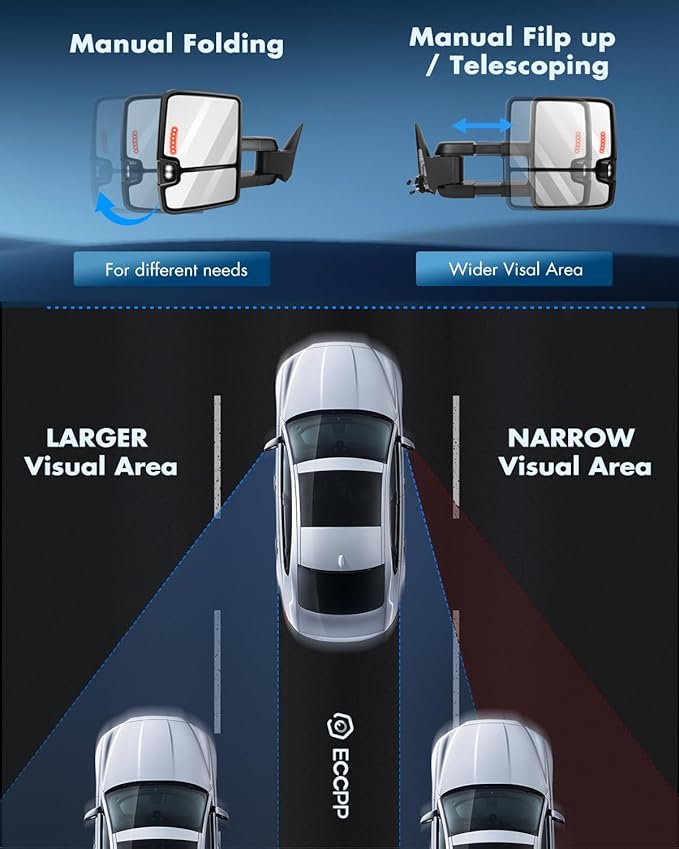- Multifunction Of Tow Mirrors - Choose from towing mirrors equipped with many different Functions: Power Adjusted,LED Turn Signal Light,Width Light,Manual Telescoping and Folding,with Chrome Housing