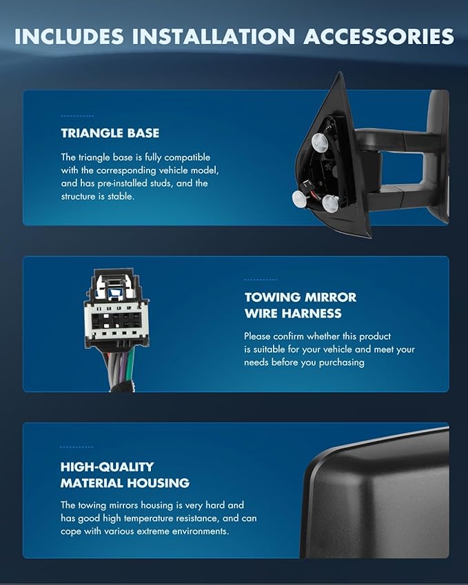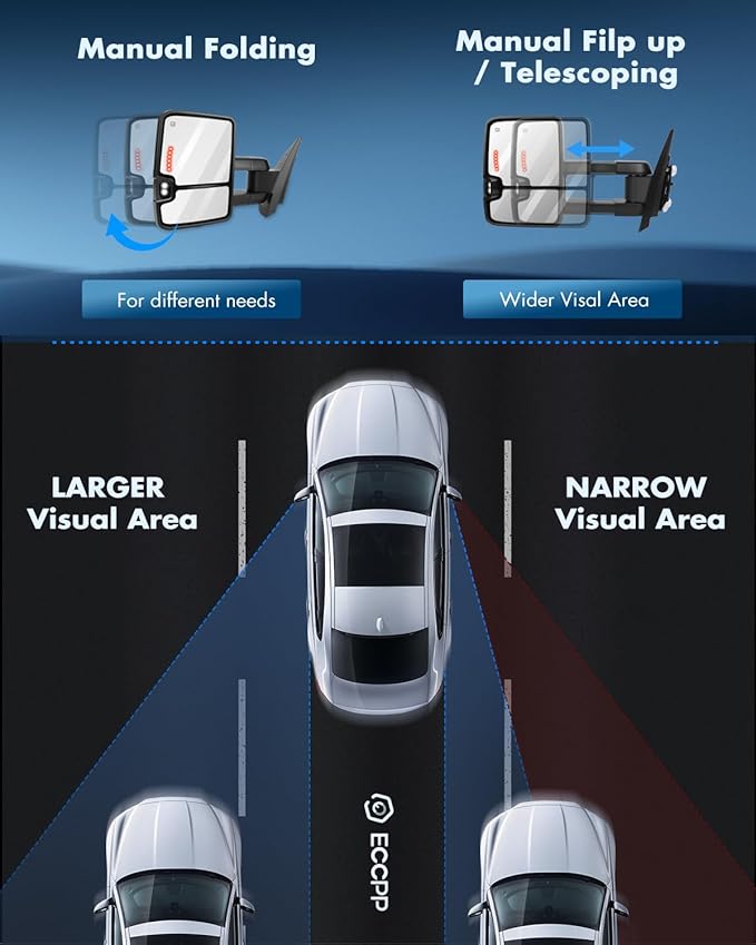 - Multifunction Of Tow Mirrors - Choose from towing mirrors equipped with many different Functions: Power Adjusted,Heated Function,LED Turn Signal Light,Running Light,Width Light,Manual Telescoping and Folding,with Black Housing