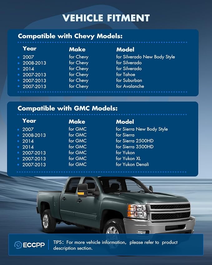 - Vehicle Fitment - The towing mirrors fit for 2007 For Chevy Silverado For GMC Sierra Pickup new body style models 2008-2013 For Chevy Silverado For GMC Sierra All Models 2014 For Chevy Silverado For GMC Sierra 2500HD 3500HD 2007-2013 For Chevy Tahoe Suburban Avalanche 2007-2013 For GMC Yukon Yukon XL Yukon Denali pickup truck