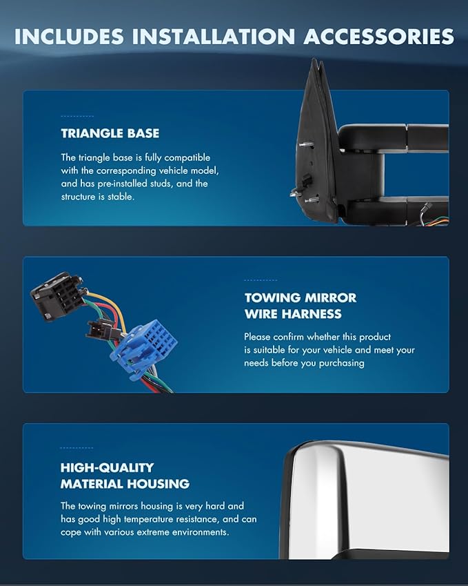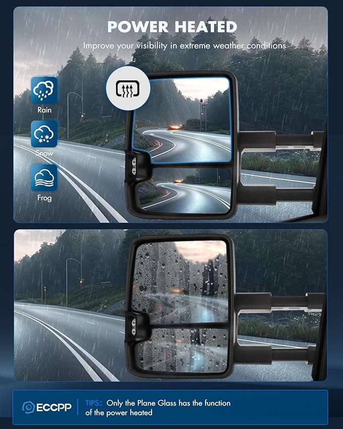 - Multifunction Of Tow Mirrors - Choose from towing mirrors equipped with many different Functions: Power Adjusted,Heated Function,Turn Signal Light,Width Light,Manual Telescoping and Folding,with Chrome Housing
