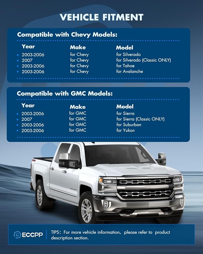 - Vehicle Fitment - The towing mirrors fit for 2003-2006 For Chevy Silverado 2007 For Chevy Silverado (Classic ONLY) 2003-2006 For GMC Sierra 2007 For GMC Sierra (Classic ONLY) 2003-2006 For Chevy Tahoe 2003-2006 For Chevy Avalanche 2003-2006 For GMC Suburban 2003-2006 For GMC Yukon 2002-2006 Cadillac Escalade/Escalade ESV/Escalade EXT pickup truck