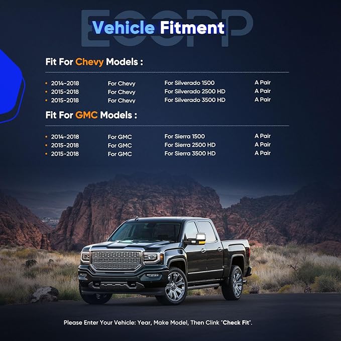 - Vehicle Fitment - The towing mirrors fit for 2014 2015 2016 2017 2018 For Chevy Silverado 1500,2015 2016 2017 2018 For Chevy Silverado 2500 HD,2015 2016 2017 2018 For Chevy Silverado 3500 HD,2014 2015 2016 2017 2018 For GMC Sierra 1500,2015 2016 2017 2018 For GMC Sierra 2500 HD,2015 2016 2017 2018 For GMC Sierra 3500 HD pickup truck