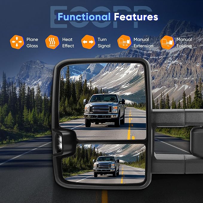 - Multifunction Of Tow Mirrors - Choose from towing mirrors equipped with many different Functions: Power Adjusted,Heated Function,LED Turn Signal Light,Running Light,Back Up Light,Manual Telescoping and Folding,with Chrome Housing