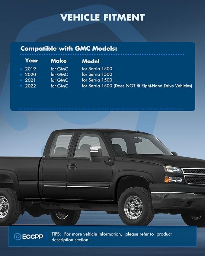 - Vehicle Fitment - The towing mirrors fit for 2019 For GMC Serria 1500 Pickup,2020 For GMC Serria 1500 Pickup,2021 For GMC Serria 1500 Pickup,2022 For GMC Serria 1500 Pickup(Does NOT fit Right-Hand Drive Vehicles) pickup truck